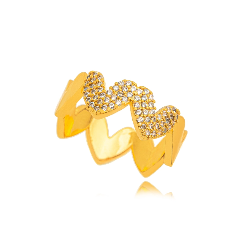 Anel Corações Micro Zircônia Confeccionado em Banho de Ouro Amarelo 18k.